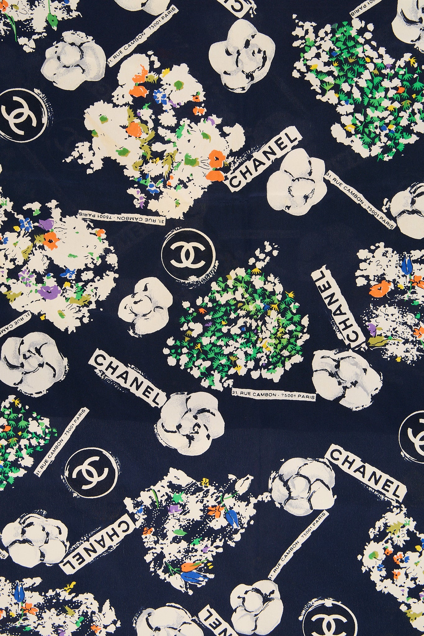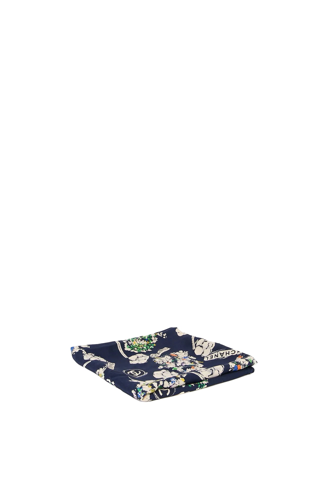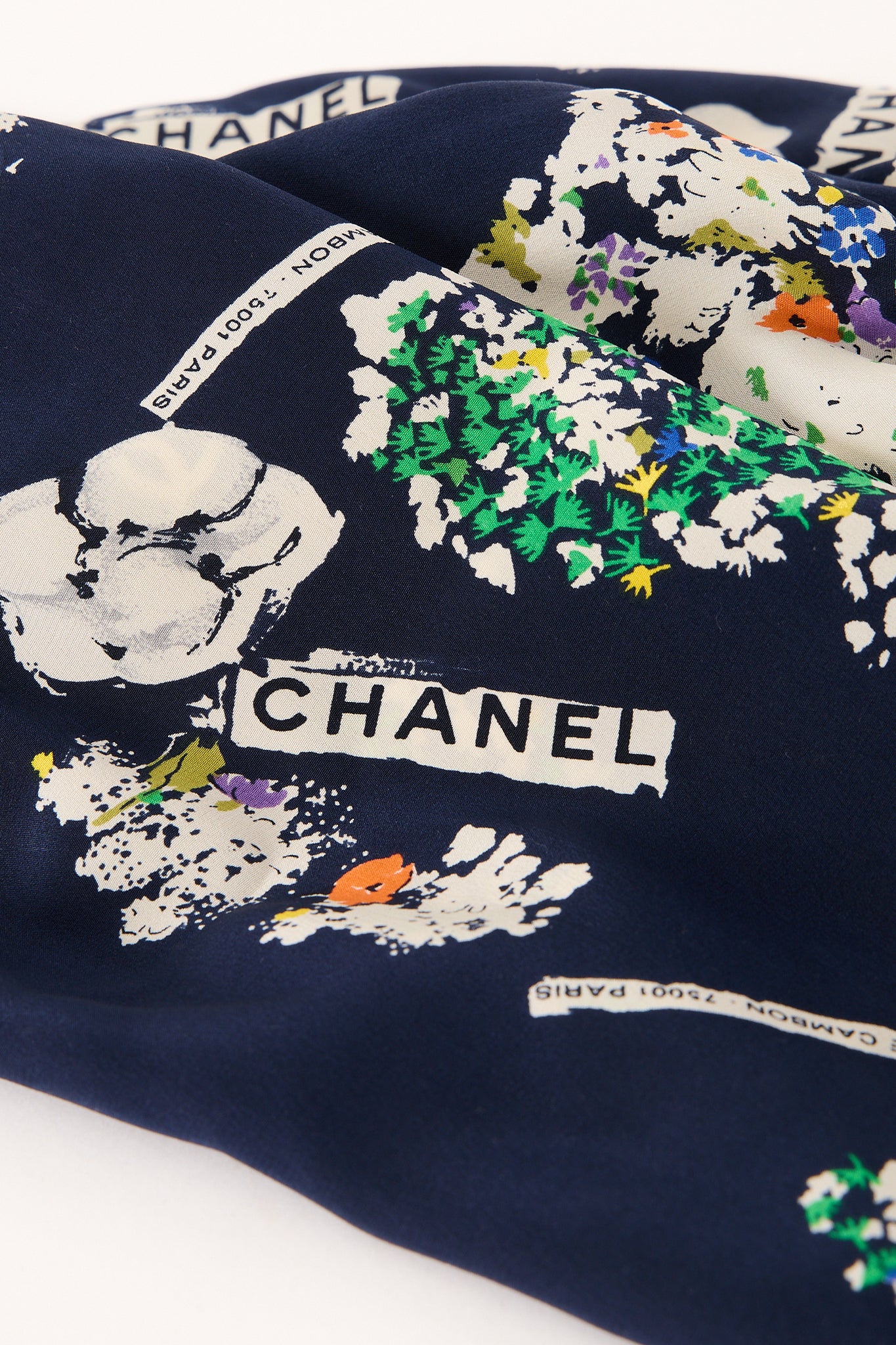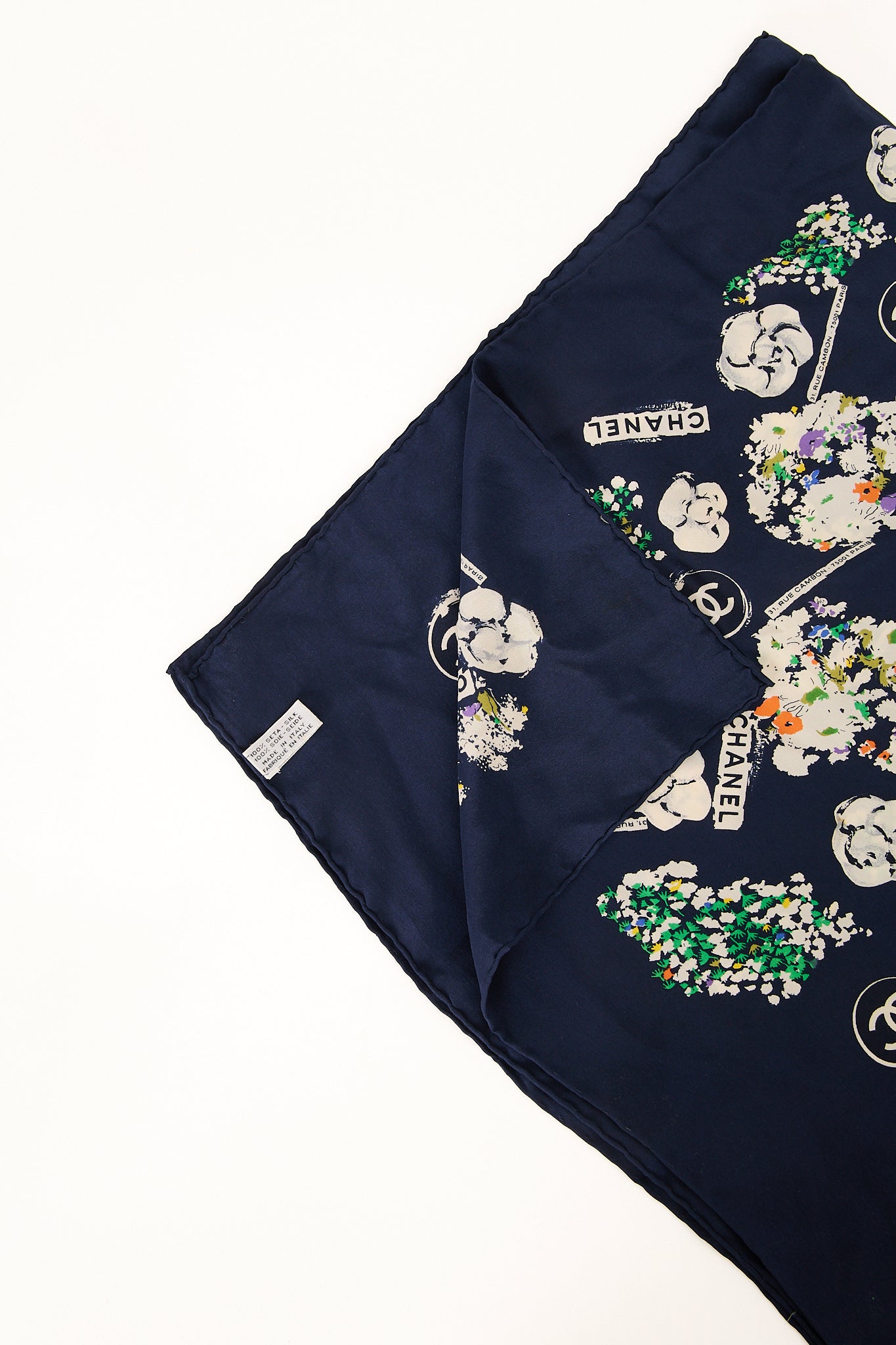 Elegant Chanel-tørklæde i marineblå med fine hvide detaljer. Tørklædet har et klassisk og tidløst udtryk, der afspejler Chanels ikoniske æstetik. Det lette materiale falder smukt og gør det velegnet både om halsen, i håret eller bundet på tasken som et sofistikeret accessory.