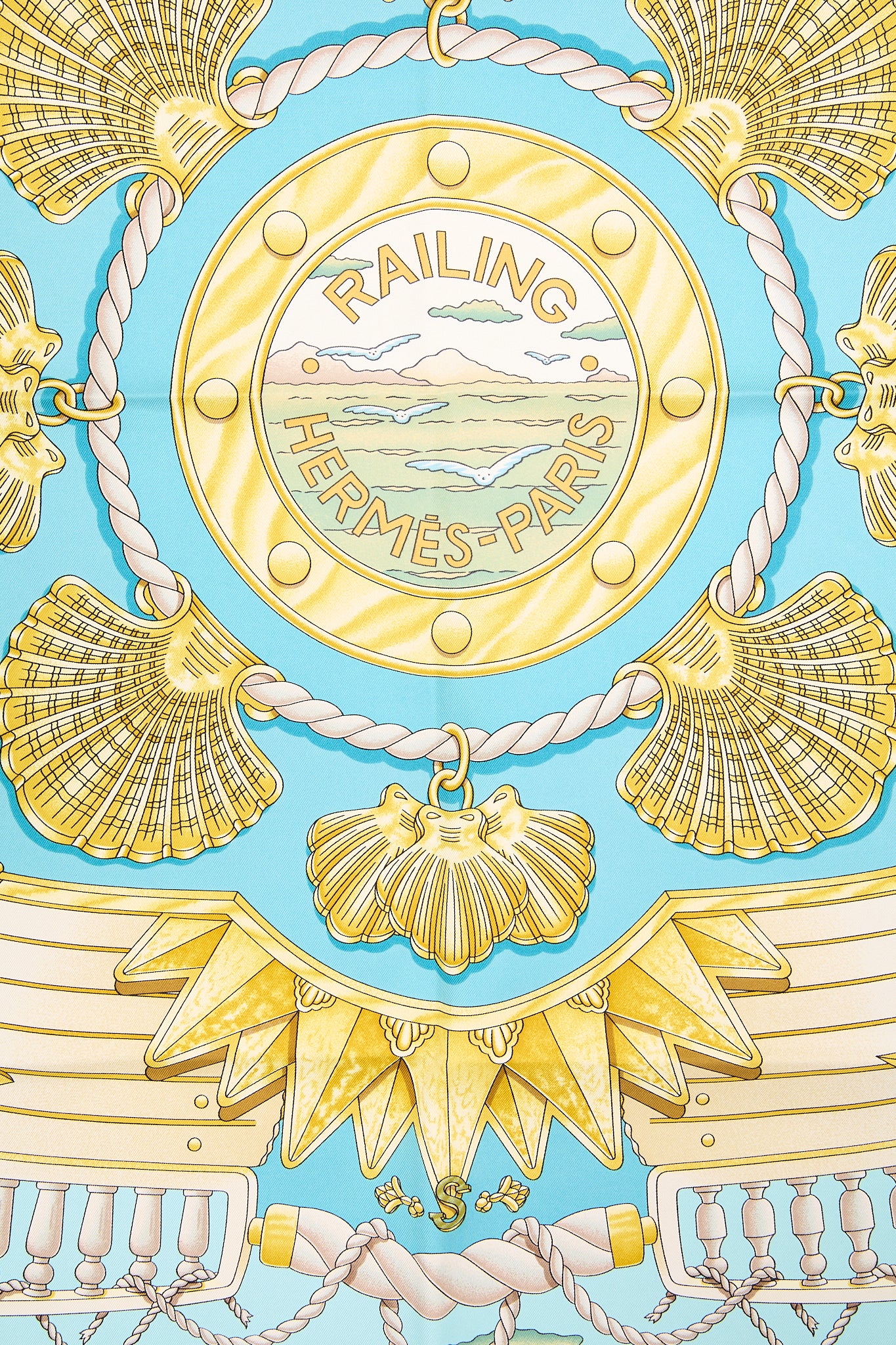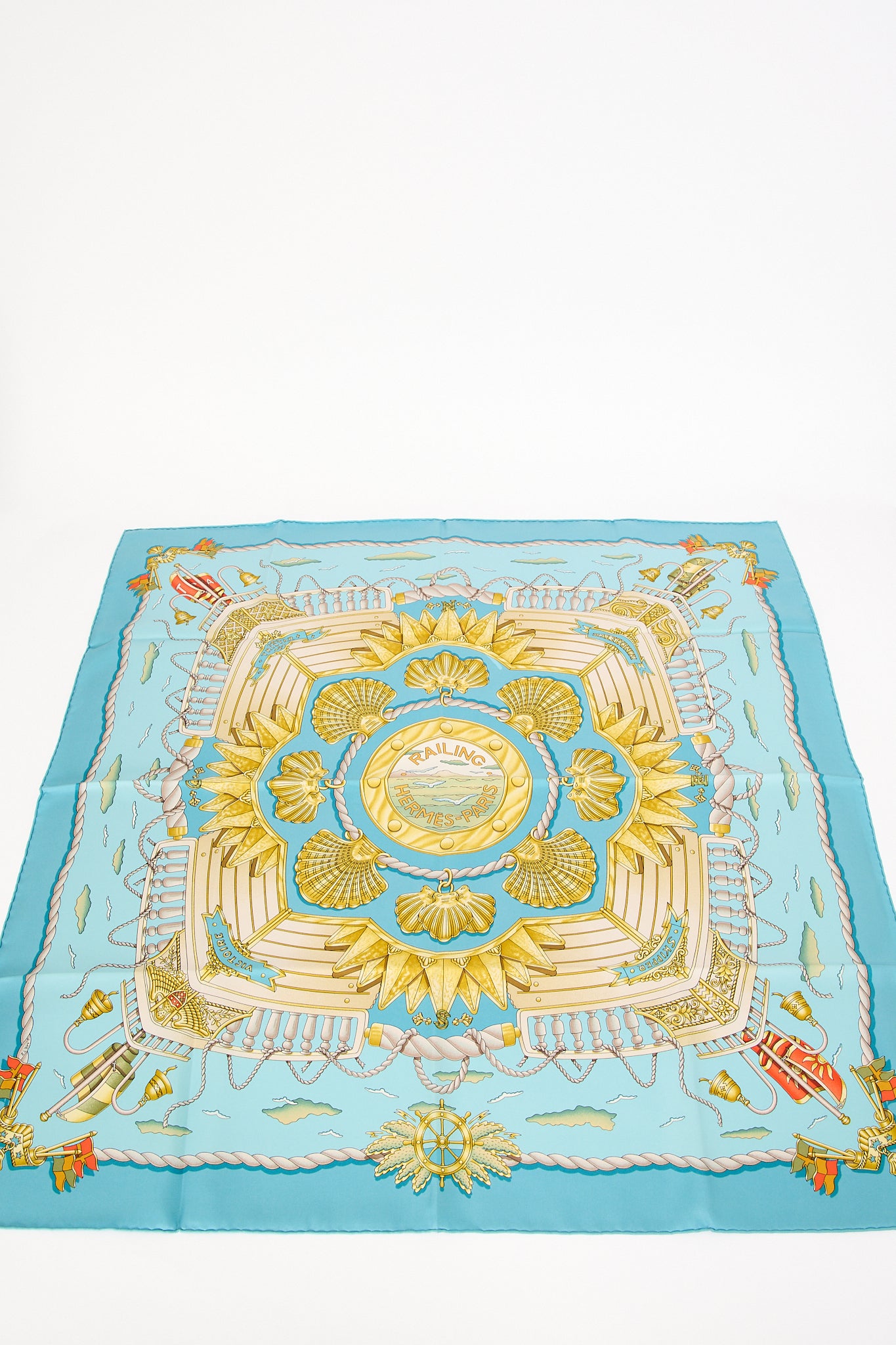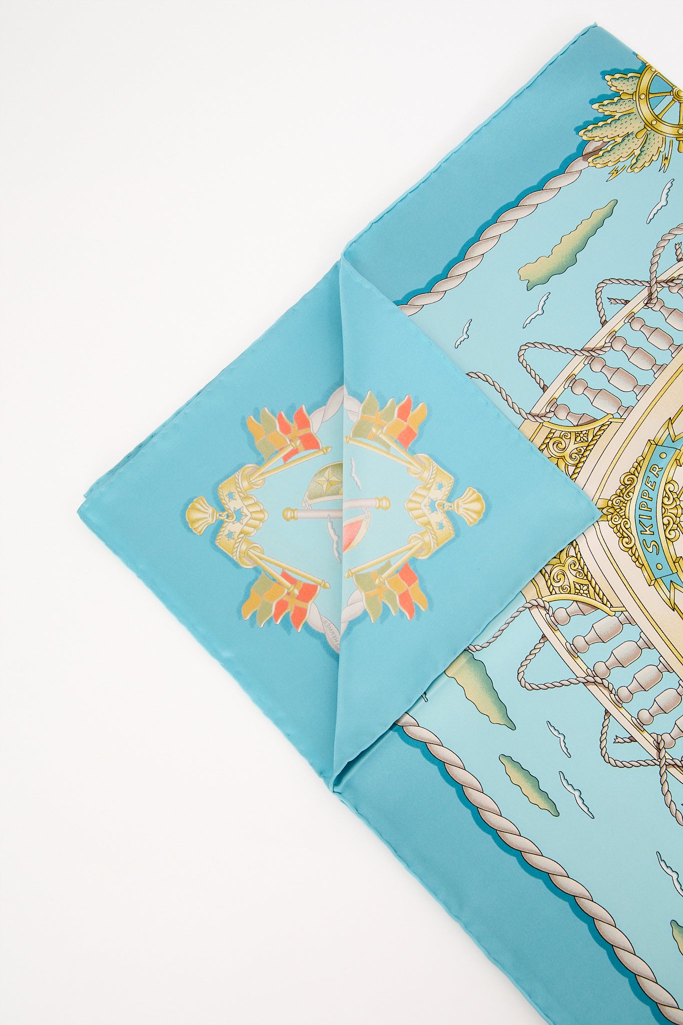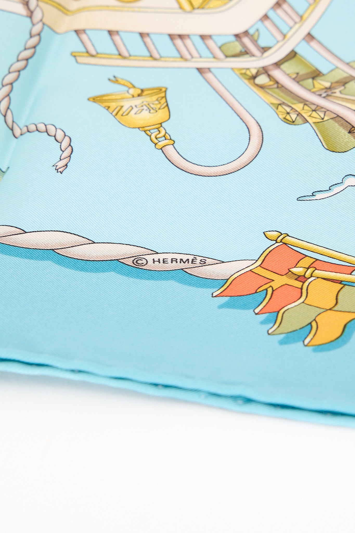 Et iøjnefaldende Hermès silketørklæde, der forener luksus og eventyr. Det maritime design i blå og gyldne toner leder tankerne mod solrige dage ved havet, og den eksklusive silke giver en smuk glans. Perfekt som elegant detalje om halsen, i håret eller på din yndlingstaske - et klassisk Hermès-accessory, der løfter ethvert look med farve og finesse.
