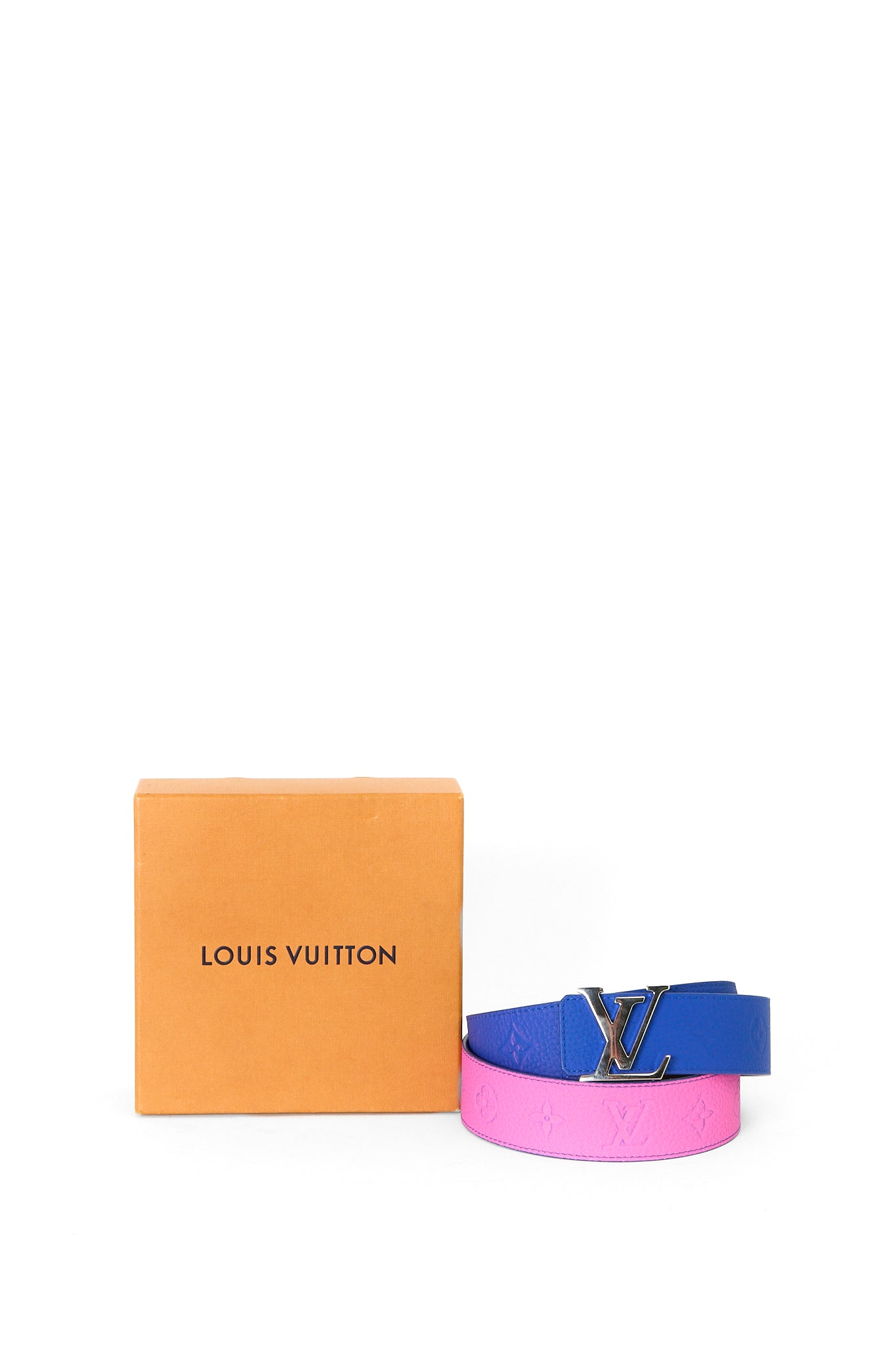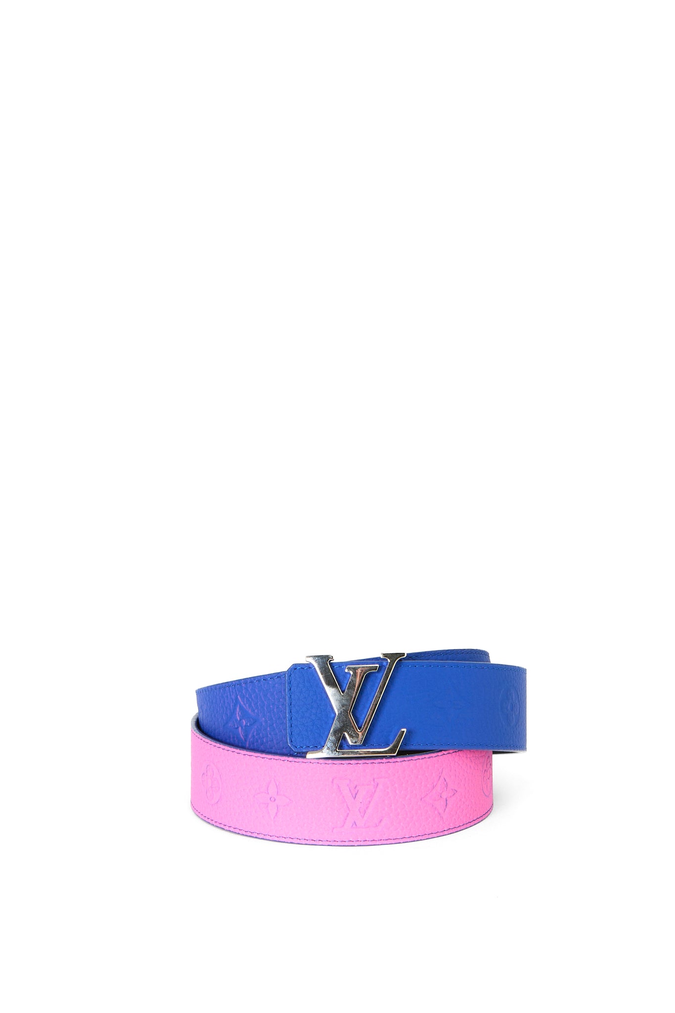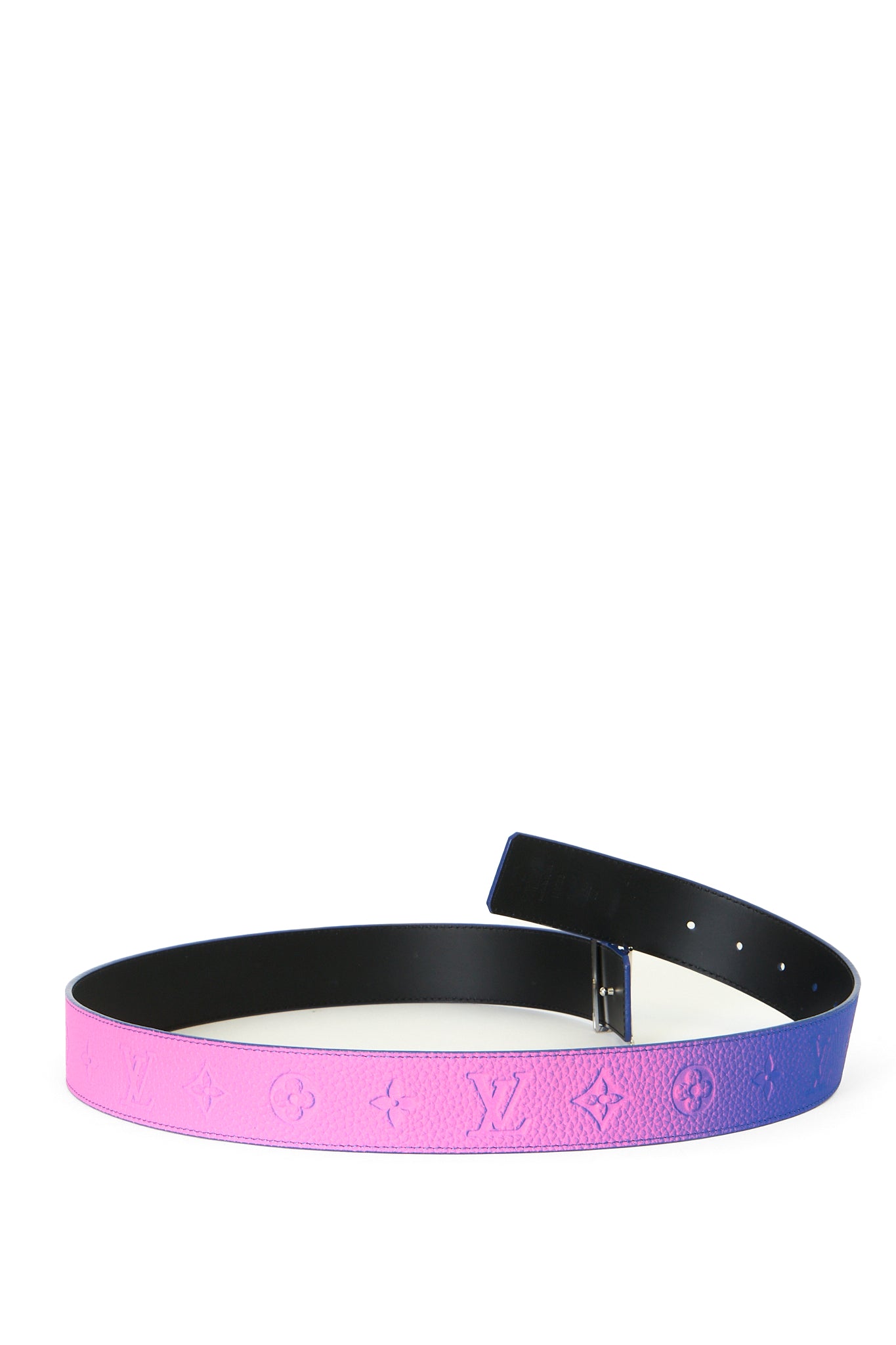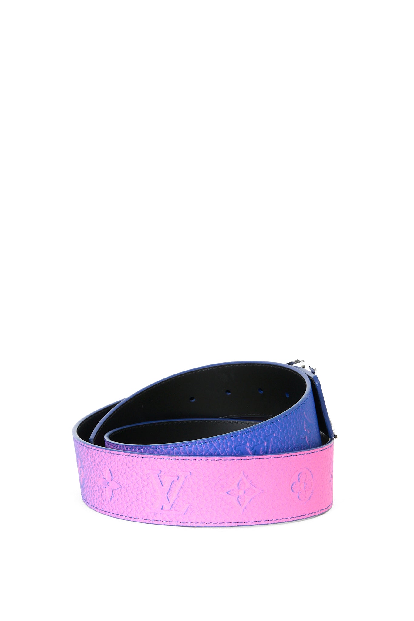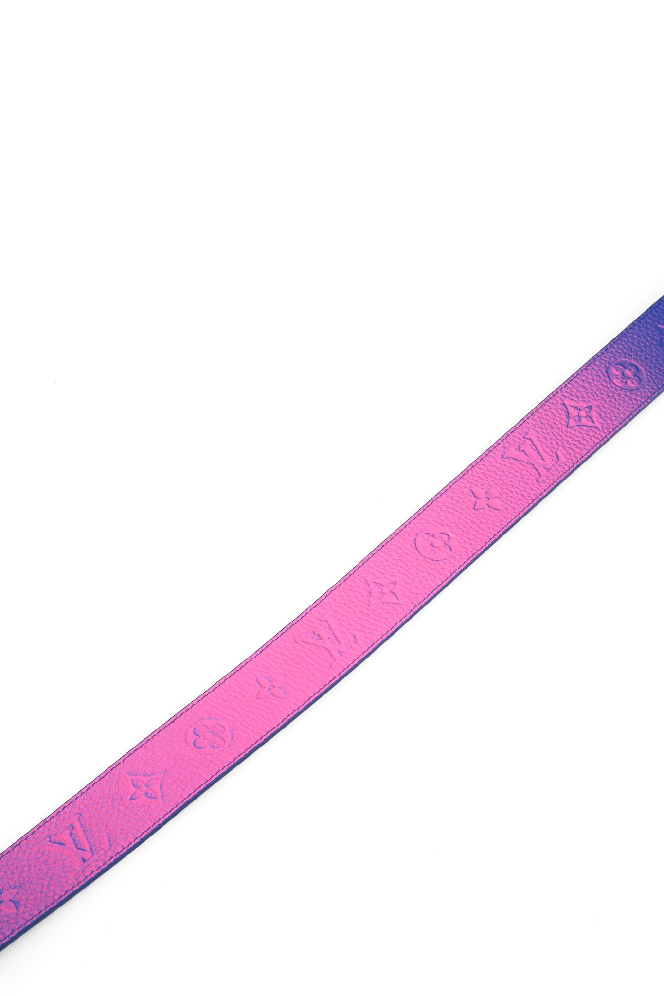 Unikt og iøjnefaldende Louis Vuitton bælte i læder med præget monogram og sølvfarvet LV-logo-spænde. Designet skifter fra blå til rosa i en ombré-effekt, der giver et moderne twist på det klassiske monogram.