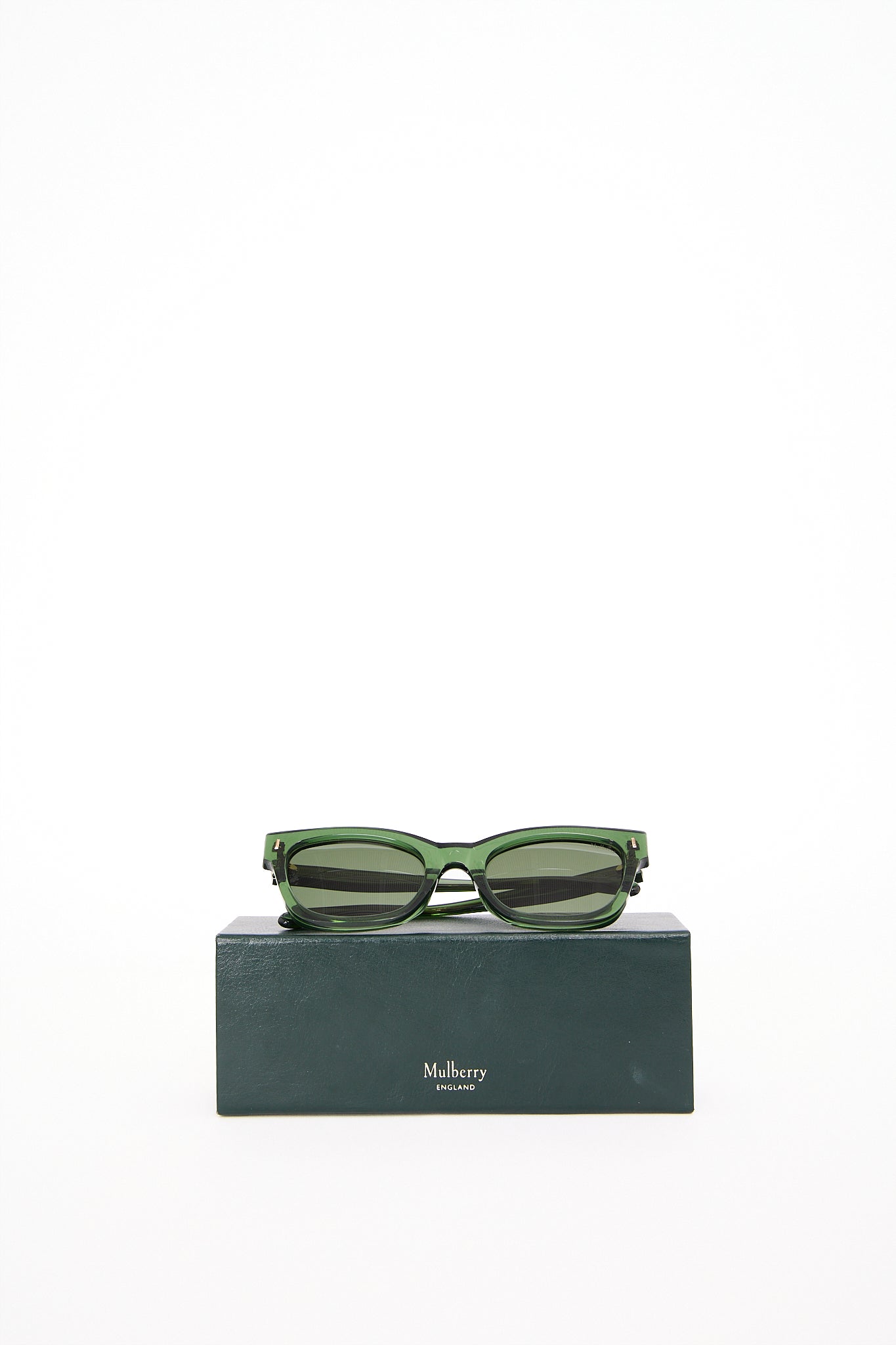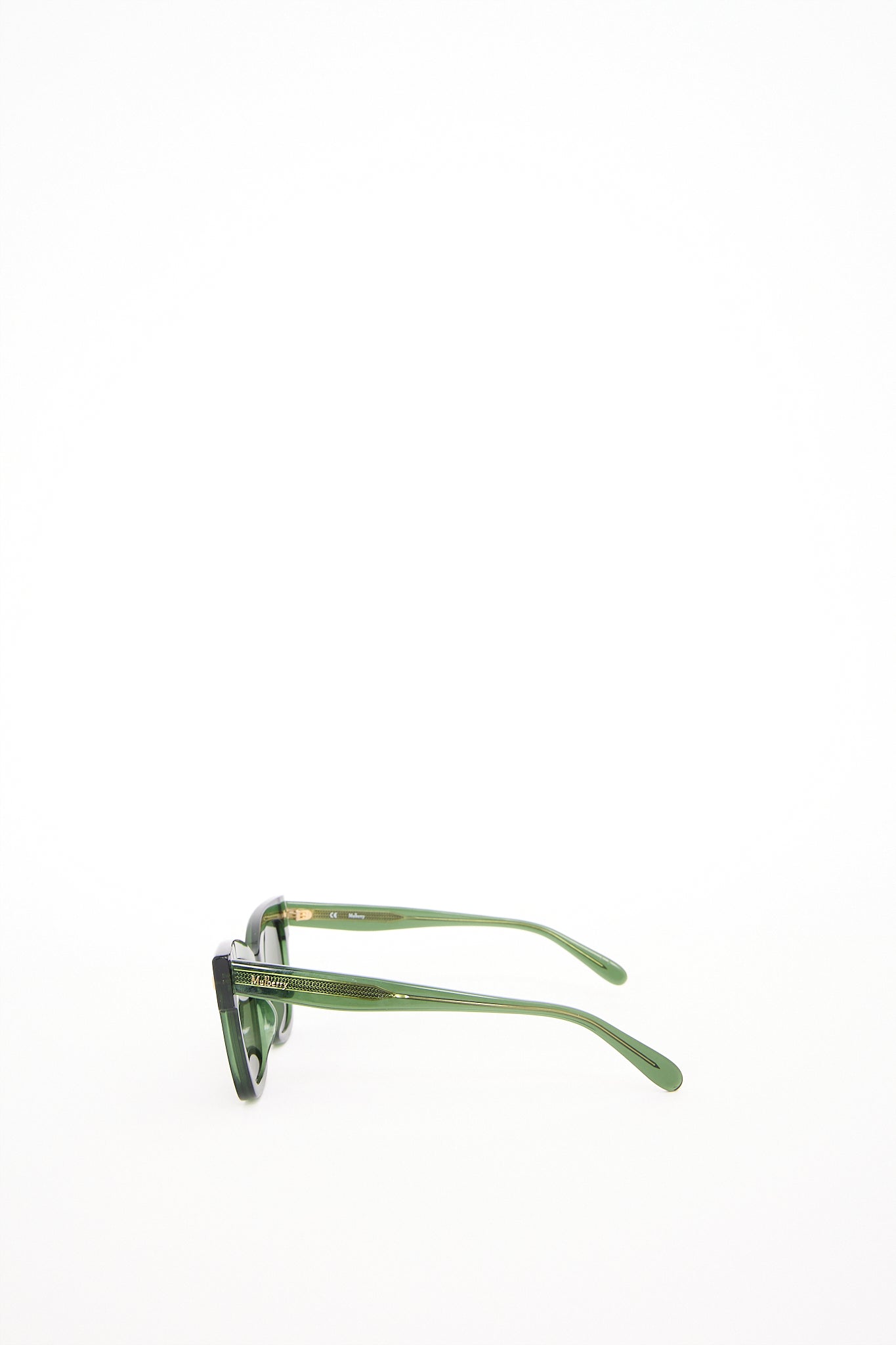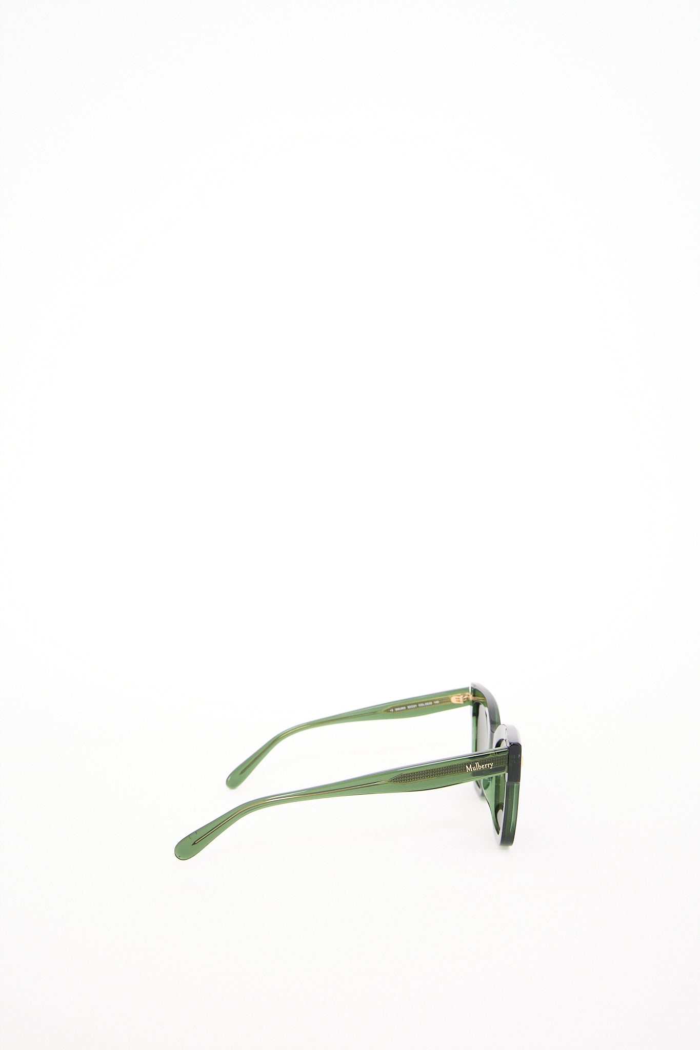 Elegante Mulberry solbriller i modellen Kate i glat mørkegrønt stel med guldfarvet detaljer og den karakteristiske Mulberry tekst på siden. Solbrillerne kombinerer britisk håndværk med moderne minimalisme - et tidløst design. Med sit rene udtryk og luksuriøse finish passer de perfekt til både hverdagsbrug og aftenlook.