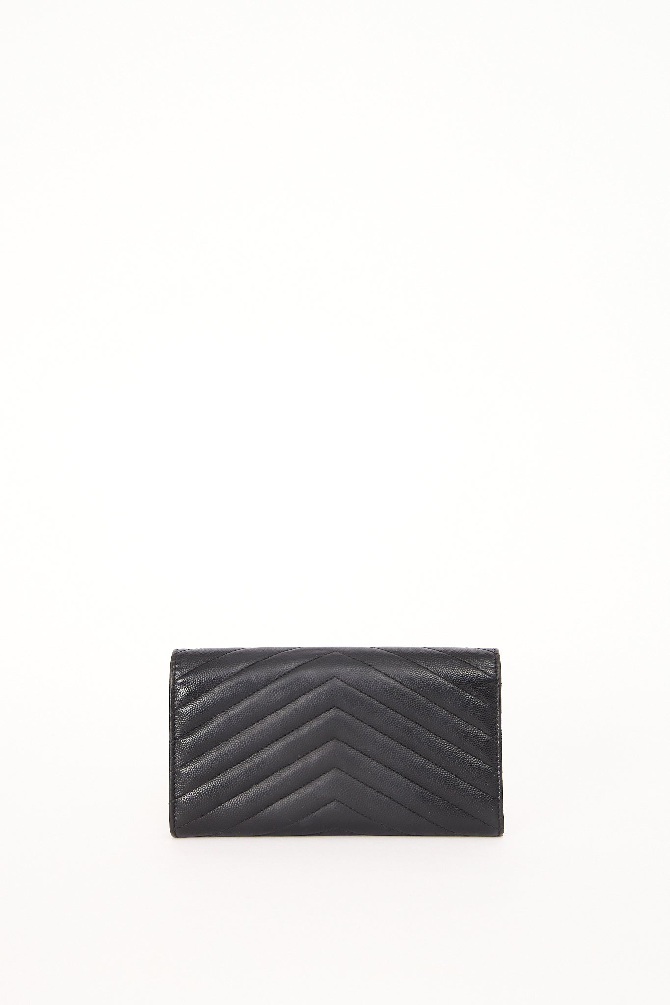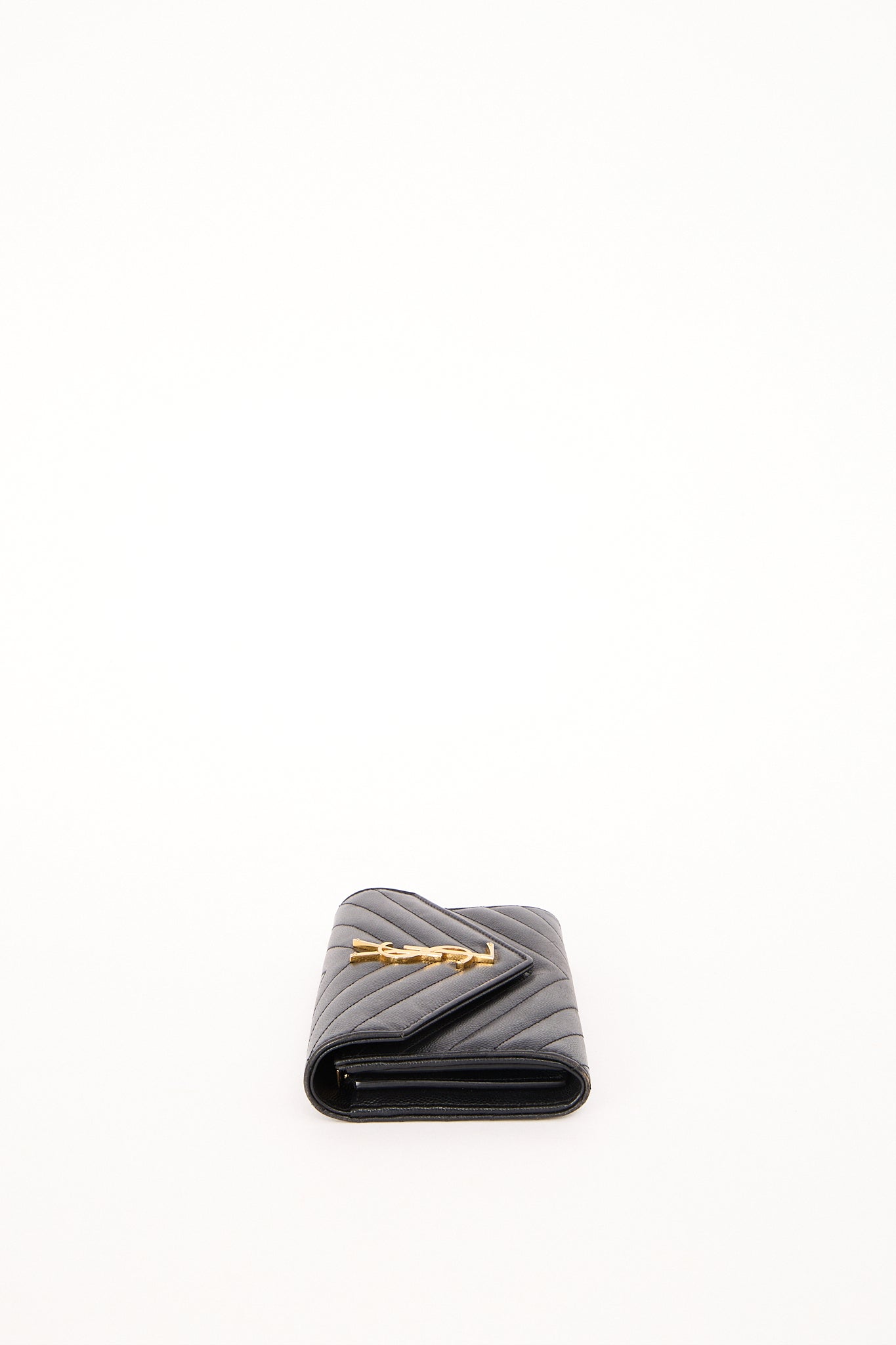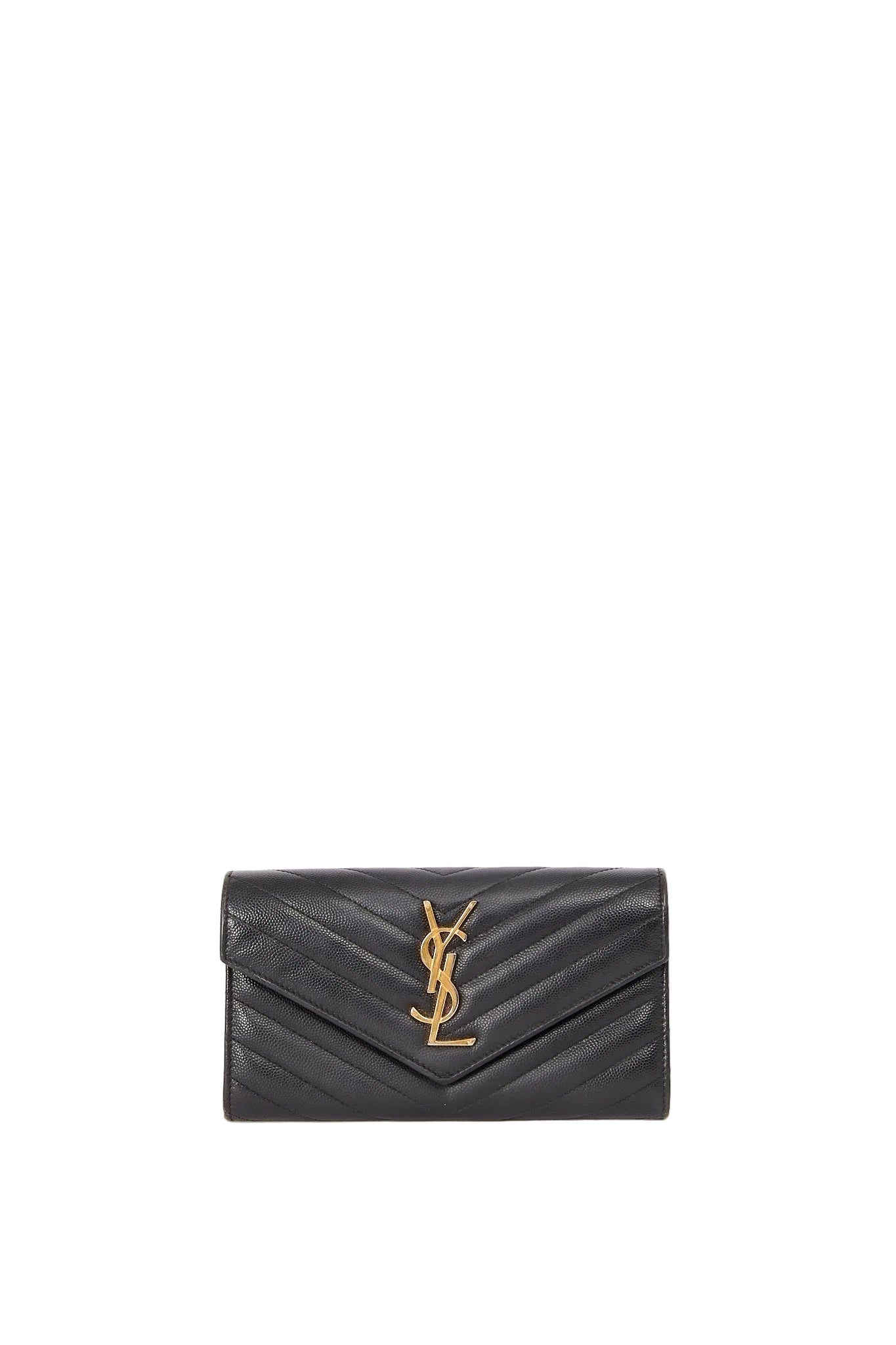 Elegant Saint Laurent pung i sort quiltet læder med det ikoniske YSL monogram i guldfarvet hardware. Den klassiske kuvertform og de fine chevron-syninger giver et eksklusivt, tidløst udtryk, som passer perfekt til både hverdag og aften. En stilren designerpung med et luksuriøst look – og et sikkert valg, hvis du elsker Saint Laurents minimalistiske æstetik.